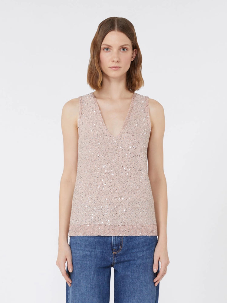 | Sequinned embroidery over a polyamide-cotton blend brings shimmering texture to this relaxed V-neck top—rib-knit finishes lend structure, creating a piece that balances statement sparkle with polished knitwear ease |