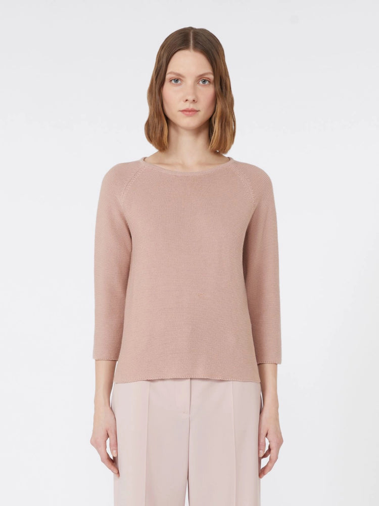 | Knitted in pure cotton with a relaxed fit and link-stitched texture, this sweater offers breathable comfort with structure—its boat neckline, raglan sleeves and raw-cut hem give everyday knitwear a refined edge |