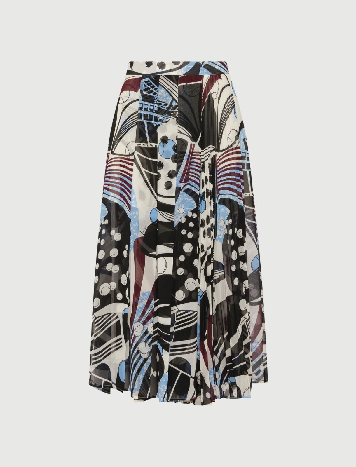 This satin skirt is set apart by its large print with geometric elements. The flared and flowing model lends itself to versatile compositions, such as a light denim shirt or double-breasted blazer..