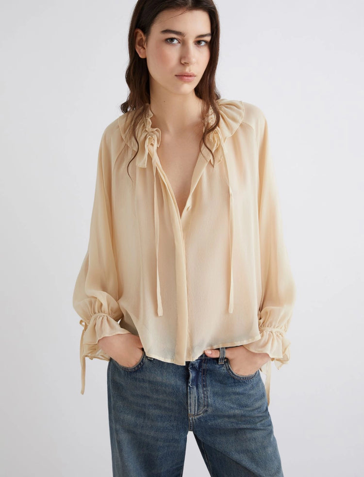 Pure silk georgette shirt featuring a soft movement-bestowing long ruche along the neckline, in addition to a romantic flair. Try it with jeans and a leather jacket to play with ultra-cool contrasts.