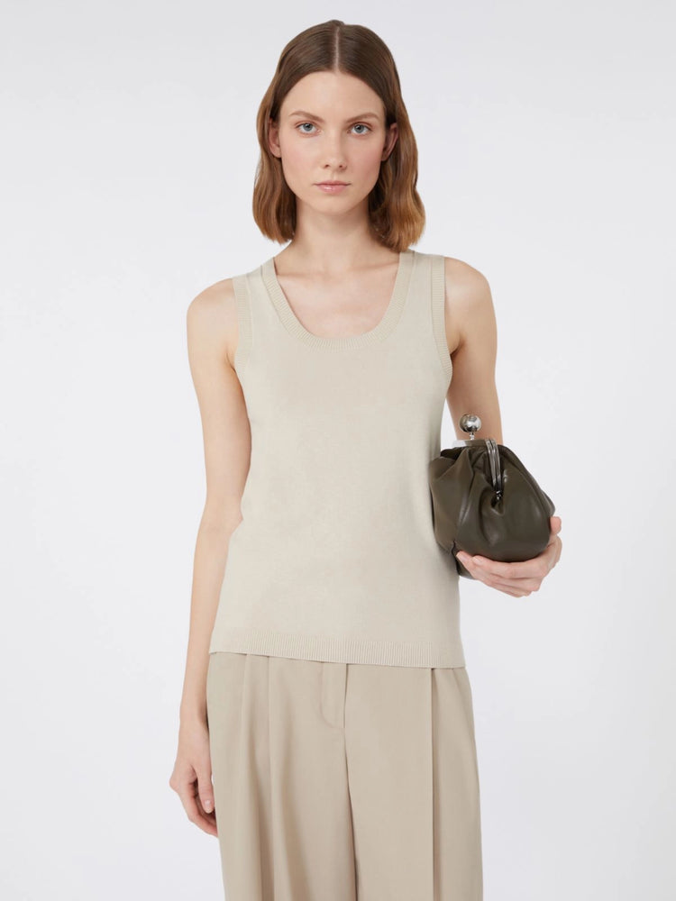 | Knit in a viscose-polyester stretch blend, this sleeveless top pairs fluid comfort with clean structure—crew-neck and ribbed edges add subtle polish while keeping layering light and effortless |