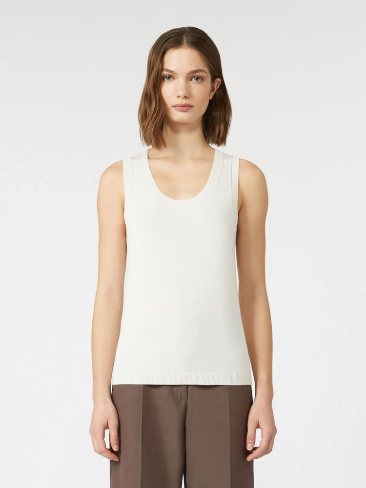 Knit in a viscose-polyester stretch blend, this sleeveless top pairs fluid comfort with clean structure—crew-neck and ribbed edges add subtle polish while keeping layering light and effortless