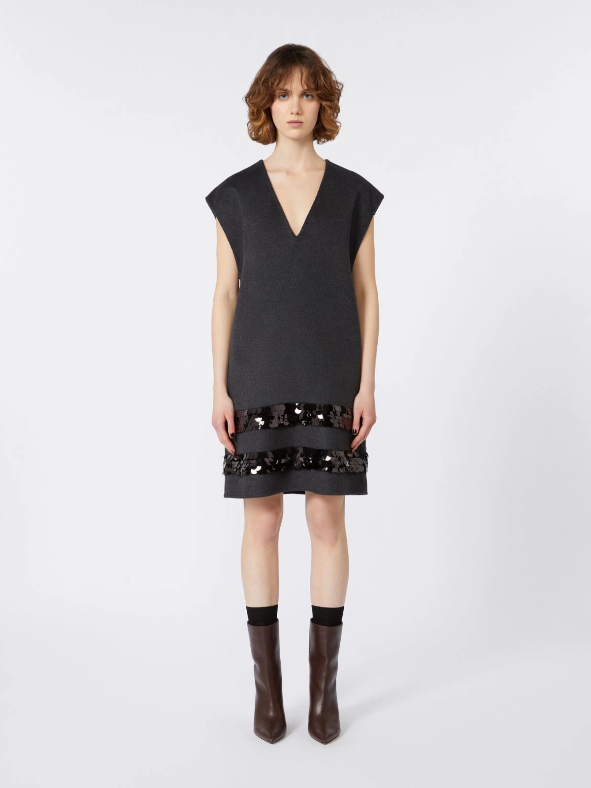 | Step into effortless glamour with the BRUNNER 1234 dress — crafted in double-layer virgin wool, tailored in a straight sleeveless silhouette with a V-neckline, concealed back zip and subtle sequin-embellished hem bands for holiday-ready elegance |