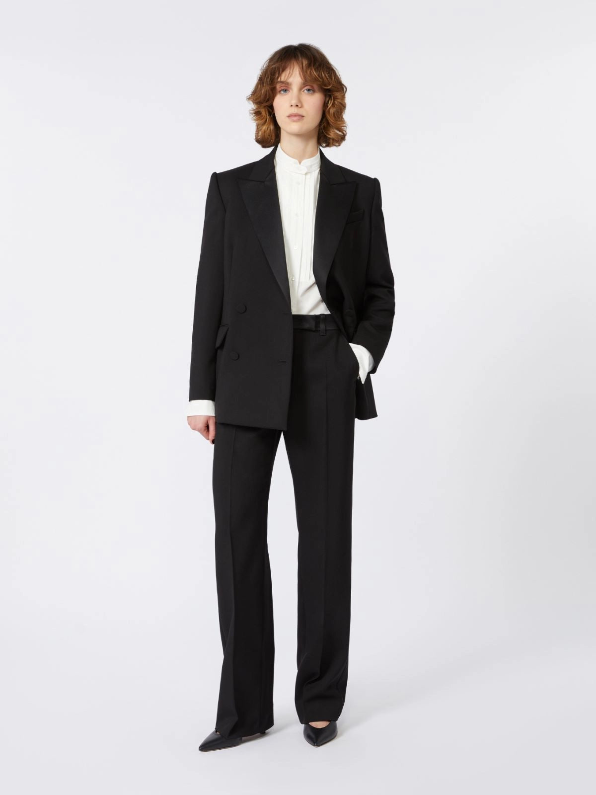 | Elevate your tailored wardrobe with the BRIGIDA1234 blazer—crafted in pure virgin-wool canvas, featuring a double-breasted front, satin-peak lapel, side back slits and elegantly tailored flap pockets—a refined essential with modern poise |