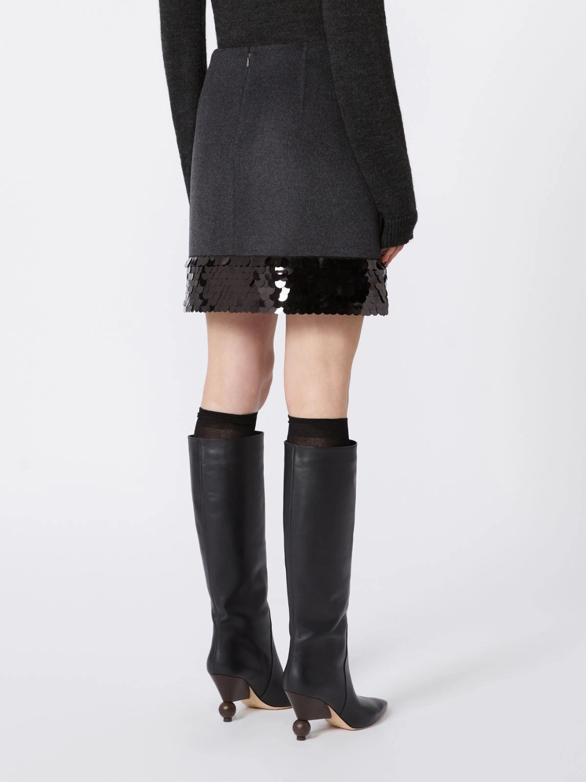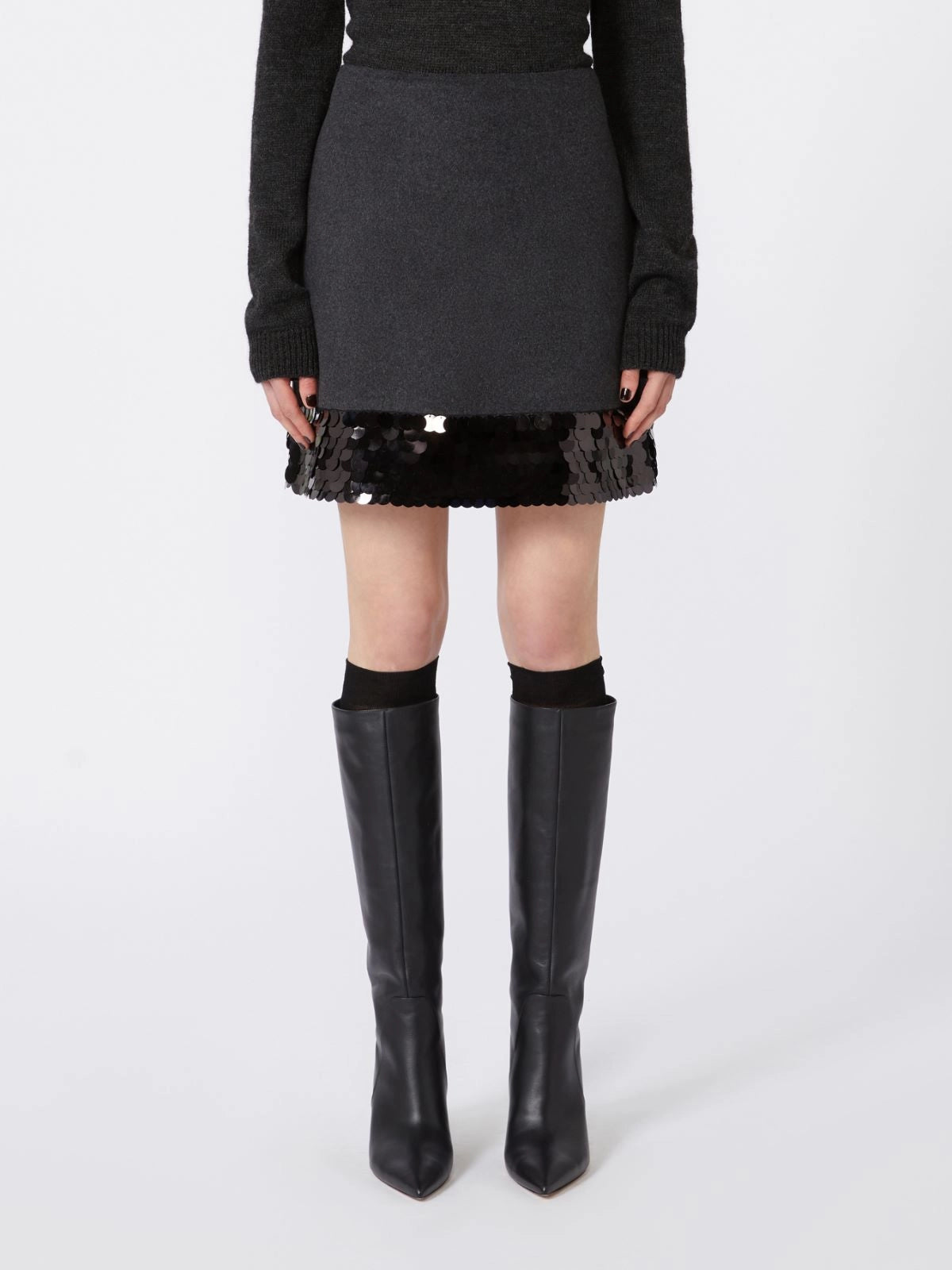 | Make a statement in the BRONTE 1234 miniskirt — crafted in a rich virgin-wool blend with hand-applied sequins at the hem, an A-line silhouette with concealed zip and tailored waist darts for effortless polish |