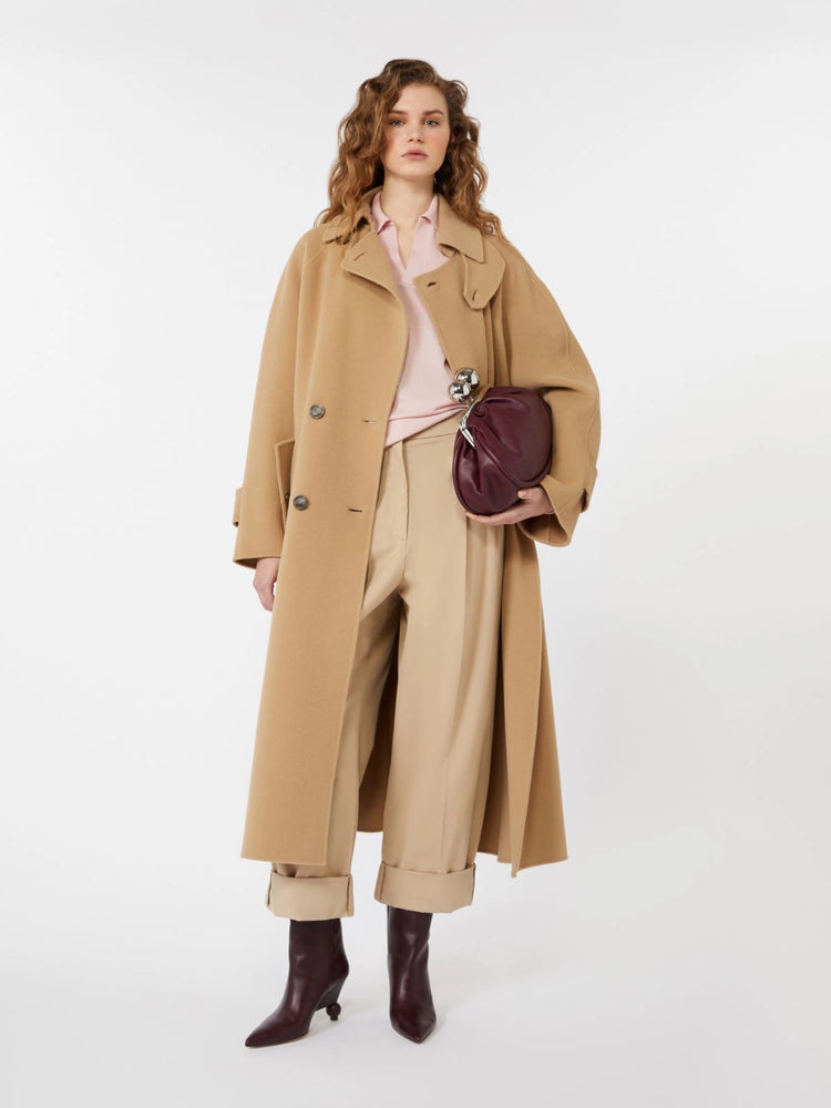 | Cut from hand-sewn, double-drap pure virgin wool, the CADINE coat brings trench-worthy structure with wraparound warmth—sleek, luxurious and entirely unlined for a bold, elegant silhouette |