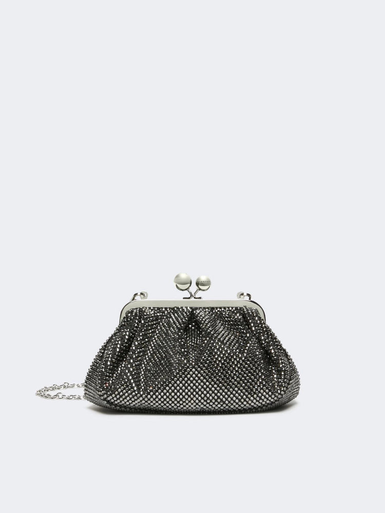 | Crafted from satin adorned with thousands of rhinestones and lined with striped fabric, the EMY Pasticcino clutch features a long removable chain strap, sculptural sphere clasp, and compact structure—designed to captivate and elevate any ensemble |