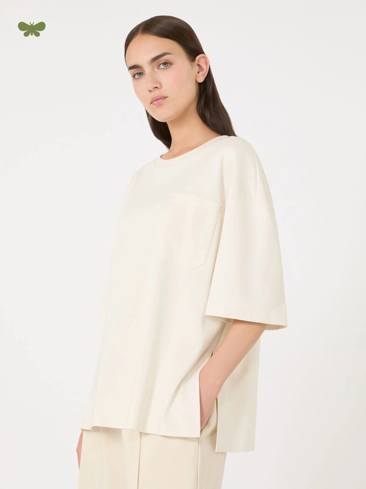 | Woven in pure organic cotton interlock, this ESEDRA T-shirt pairs oversized comfort with crisp detailing—crew neck, drop-shoulder sleeves, patch pocket, and side-split hem all crafted to elevate a basic staple with effortless polish |