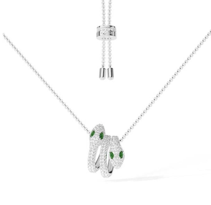 This necklace is a bold and symbolic statement piece with a touch of mystery and luxury: Pendant: A striking double-snake design, fully encrusted with shimmering pavé stones. The two serpent heads are detailed with vivid green gemstone eyes, adding an exotic and captivating contrast. Chain: Fine silver-tone chain with subtle bead stations along its length, enhancing the overall sparkle and elegance. Finish: Bright silver-tone with pavé embellishment for a radiant look. Style: Edgy, modern, and alluring — a perfect balance of power and elegance. Occasion: Ideal for evening wear, statement styling, or anyone wanting a daring yet refined piece. |