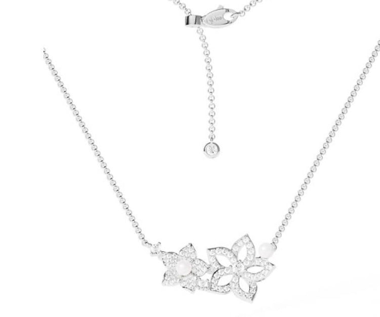 | This necklace is a delicate floral-inspired piece with a feminine and elegant charm: Design: Features two sparkling floral motifs inlaid with pavé stones, accented by dainty pearls at their centers and edges. Material: Polished silver-tone finish with fine detailing for extra brilliance. Style: Romantic and graceful — perfect for both daytime sophistication and evening elegance. Clasp: Adjustable chain with a small round stone at the end for added sparkle. |