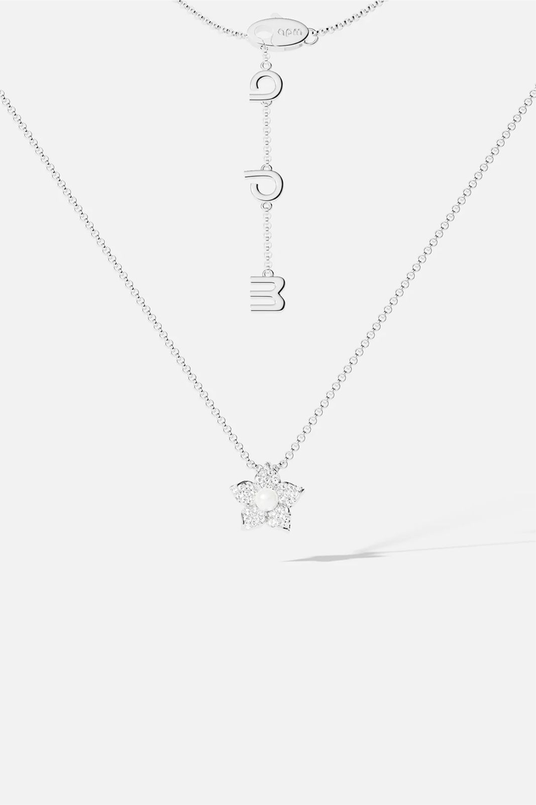 his necklace is a refined floral-inspired design with a touch of timeless elegance: Pendant: A five-petal flower fully encrusted with pavé stones, centering a lustrous pearl for a delicate and sophisticated focal point. Chain: Fine silver-tone chain with polished links for a sleek look. Details: Signature APM Monaco letter charms are integrated near the clasp, adding a modern branded accent. Finish: Bright silver-tone with a high-polish shine. Style: Feminine, graceful, and versatile — perfect for adding a subtle sparkle to both everyday outfits and special occasions. |
