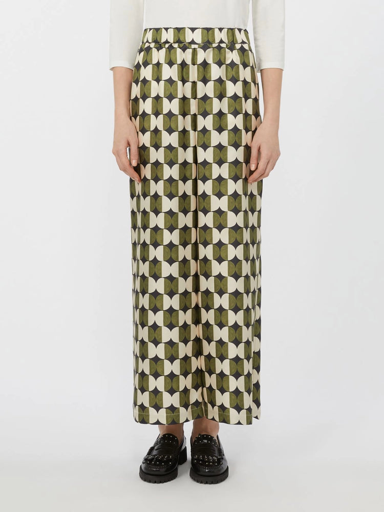 Made entirely from pure silk twill, these trousers offer fluid elegance with wide-leg comfort—elastic waist, slanted pockets, and printed pattern combine for elevated ease in a sunset-to-evening silhouette