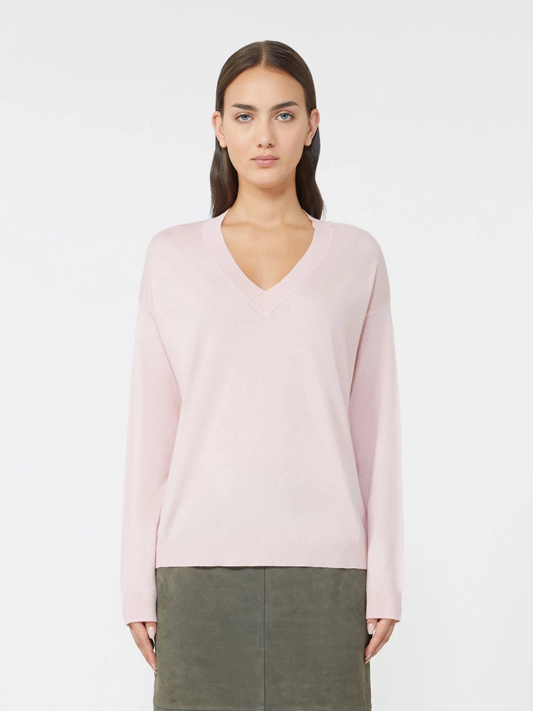 | Knitted in a luxe blend of 90% virgin wool and 10% cashmere, this V-neck jumper delivers sublime softness—its loose silhouette, dropped shoulders, and ribbed trims make every wear feel like a gentle embrace |