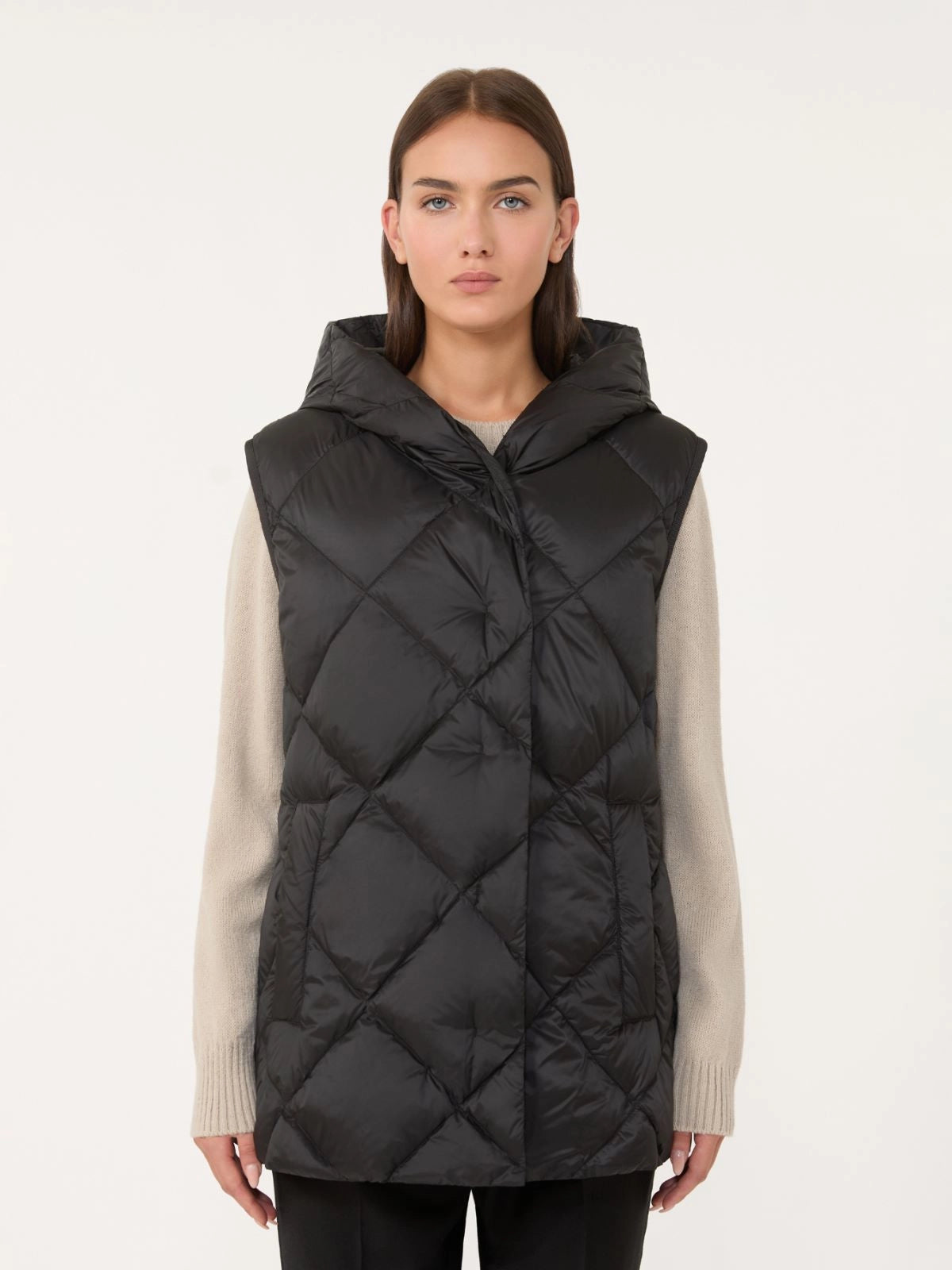 In water-repellent tech fabric with goose-down padding, the FRUTTO hooded gilet offers lightweight warmth and wind-shielding style—finished with a butterfly emblem, snap front, and sleek side pockets for urban edge |