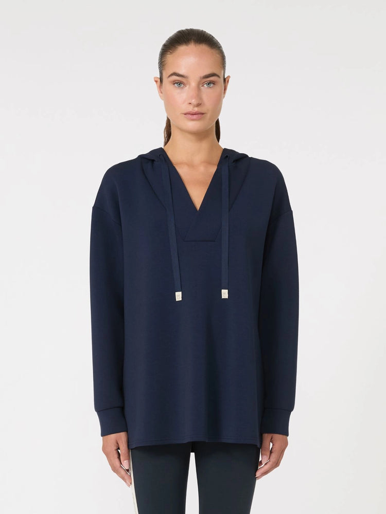 Made in soft scuba jersey with a modal-rich blend, this sweatshirt offers lightweight stretch and drape—oversized silhouette, crossover V-neck and wide slits give relaxed luxury with statement comfort