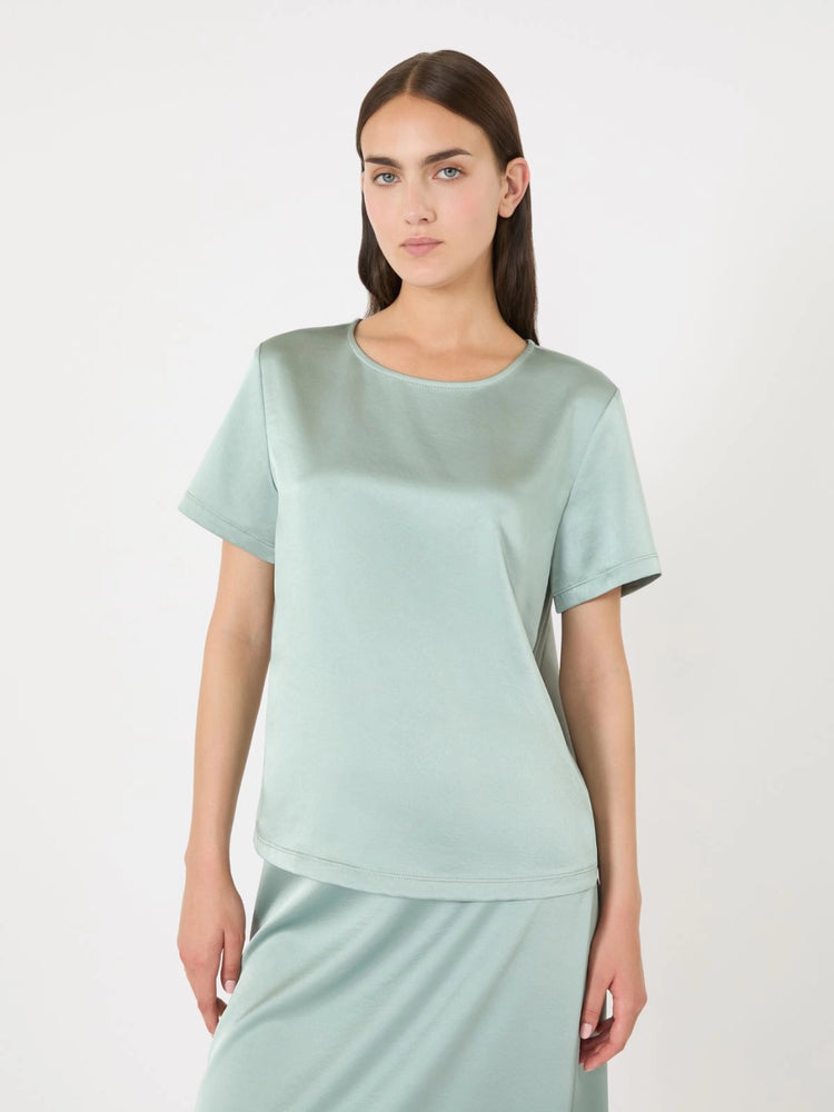 | Blending sleek satin front with soft stretch interlock jersey at the back, this GILBERT tee delivers refined texture and fluid comfort—crew neck and button-keyhole detail combine for elevated ease you’ll reach for again |