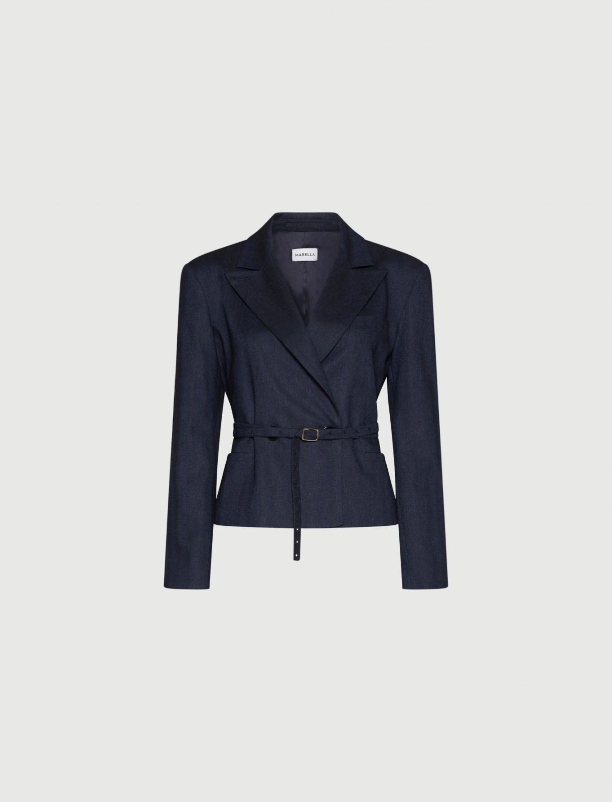 The subtle denim effect transforms this short jacket into a true seasonal all-rounder: wear it with cigarette trousers and a light blouse for a contemporary business look.