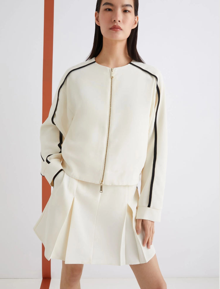 A quintessential active chic style: this satin bomber jacket is ideal for days off, thanks to its vibrant contemporary streetwear energy. It cinches at the back of the waist and boasts a contrasting stripe on the sleeves for a racing effect.