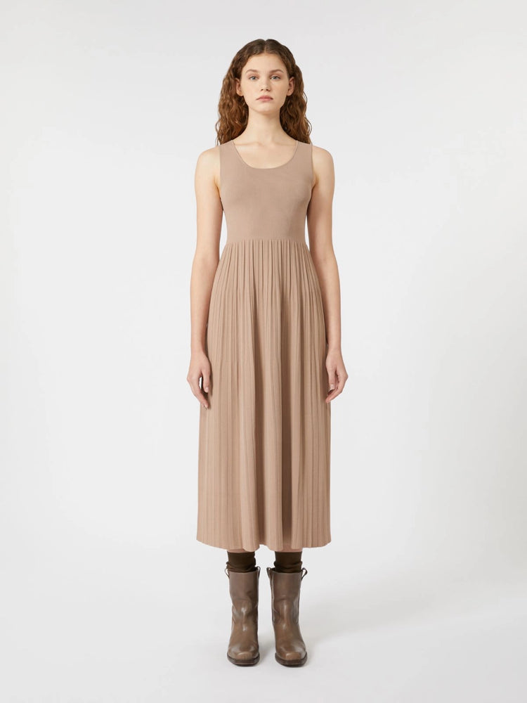 | With a viscose-crepe yarn top and a plissé-pleated lower skirt, the Markus dress in Marron Glacé’ drapes with fluid elegance—sleeveless with wide straps, a rib-knit bodice, and an unlined flare that moves effortlessly |