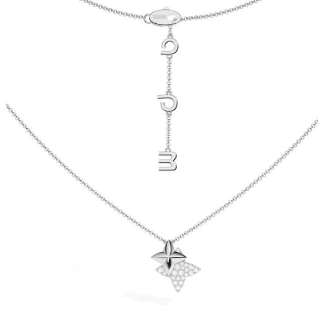 | This necklace is a modern floral-inspired pendant design that blends elegance with sparkle: Design: A four-petal flower pendant, half in high-polish silver tone and half encrusted with pavé stones. Style: Sleek, minimalist, yet glamorous — a fresh twist on a classic floral motif. Chain: Fine silver-tone chain with branded clasp detail, balancing delicacy with refinement. Occasion: Perfect for everyday chic or as a subtle accent for evening wear. |