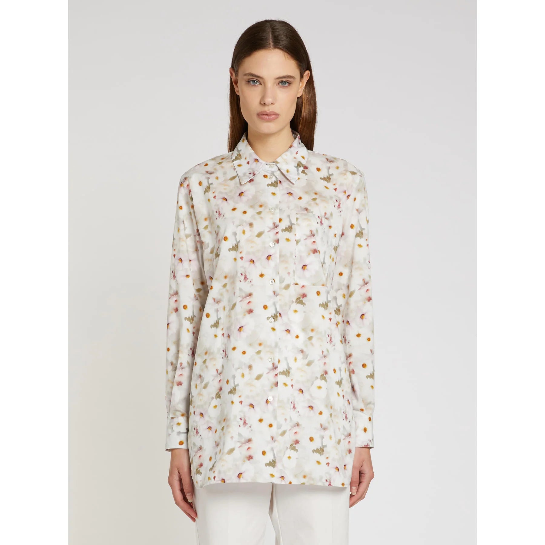 - Stretch cotton poplin shirt- Oversized fit- Shirt collar- Visible button fastening- Patch breast pocket