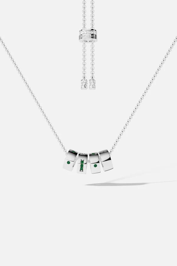 | Introducing the APM love language… This necklace is embellished with the word LOVE in Morse Code. All our products are handcrafted in our ateliers Material: Sterling silver Stone: Green cubic zirconia Color: Silver Total chain length: Adjustable to 65 cm max with sliding clasp |