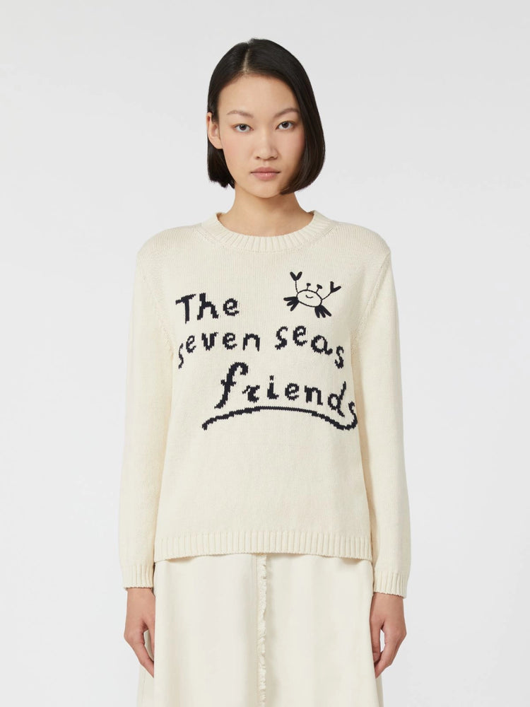 | the NESPOLA sweater in ivory delivers breathable softness with structured detail—crew neck, rib trims and an inlaid collection motif finish it with effortless elegance |