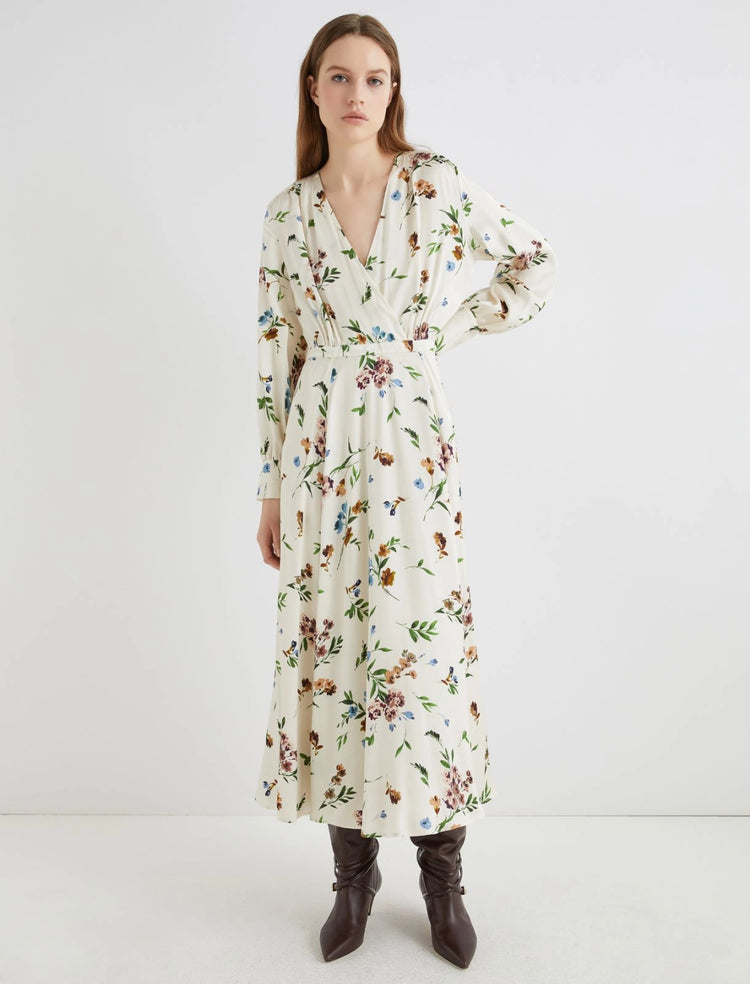 An ultra-feminine criss-cross dress meets a light floral pattern. The flared, lined skirt adds volume to the hem, for a streamlined silhouette.
