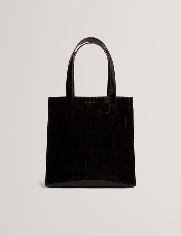 | A compact tote with a bold croc-textured patent finish, designed to stand out while staying practical. Featuring subtle foil branding, double top handles, and an internal zip pocket, it’s the perfect everyday accessory. |