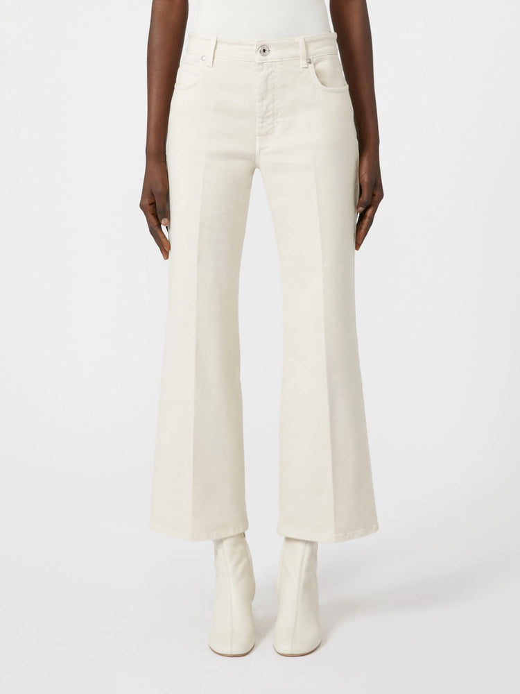 | Made in stretch cotton bull denim with slight flare and clean tailoring details—these jeans combine press-pleats, fly-covered zip and a structured waistline for polished ease and comfort |