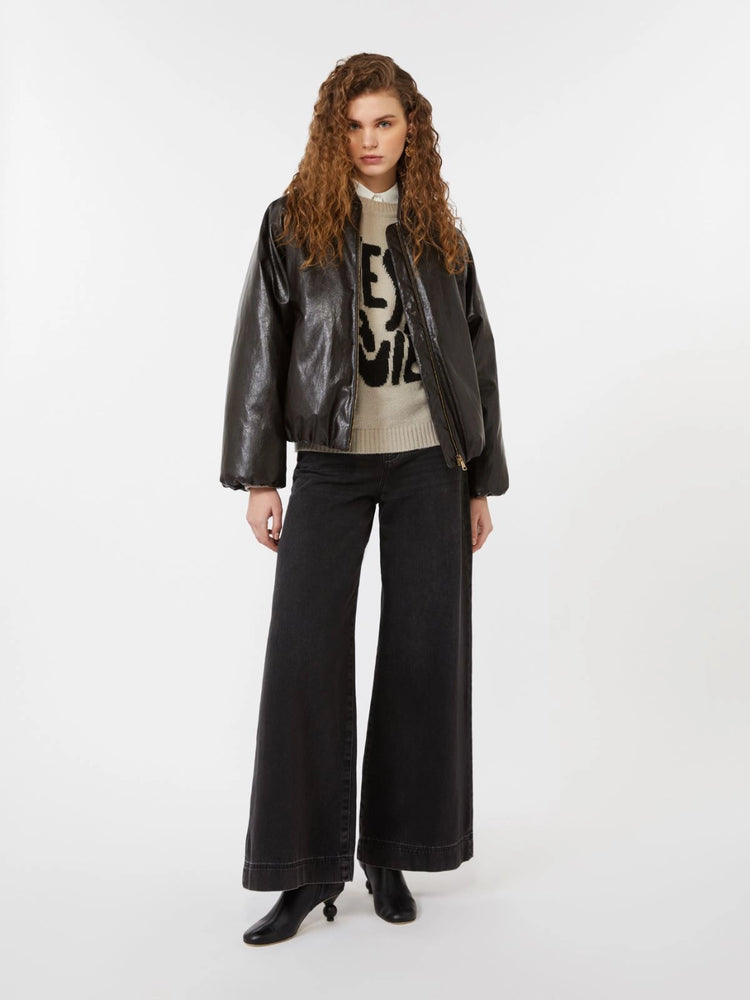 | Filled with virgin goose-down and crafted in coated jersey with an aged chocolate finish, the Potente bomber blends warmth and edge—boxy silhouette, raglan sleeves, stretch-knit collar, and gathered hems for statement softness |