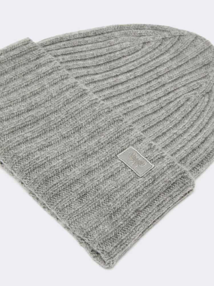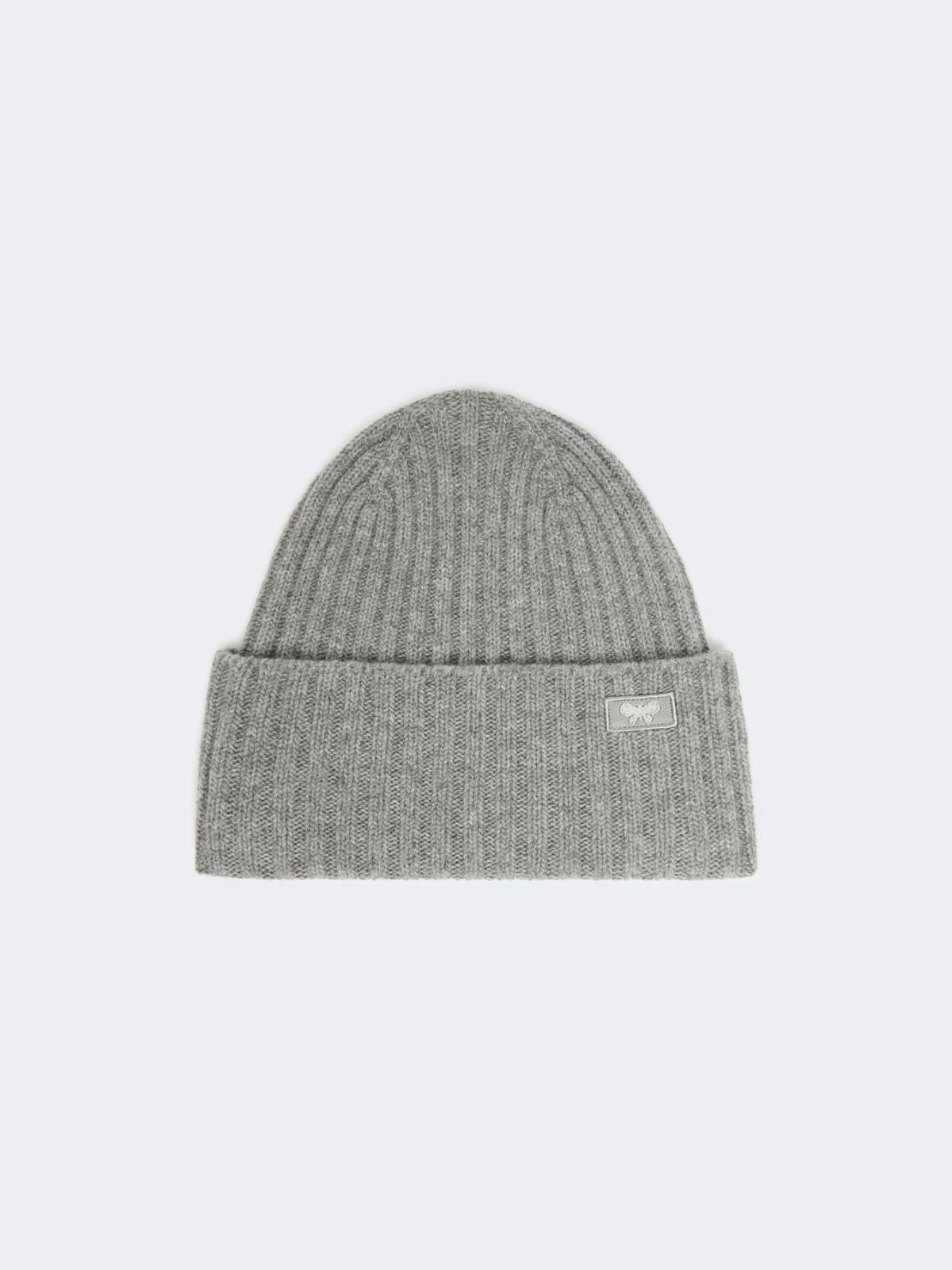 | Elevate your winter ensemble with the Ritmo beanie — crafted in 100% virgin wool with a fisherman’s-rib knit and turned-edge finish, accented by a subtle butterfly label — a minimalist luxury statement in refined medium grey |