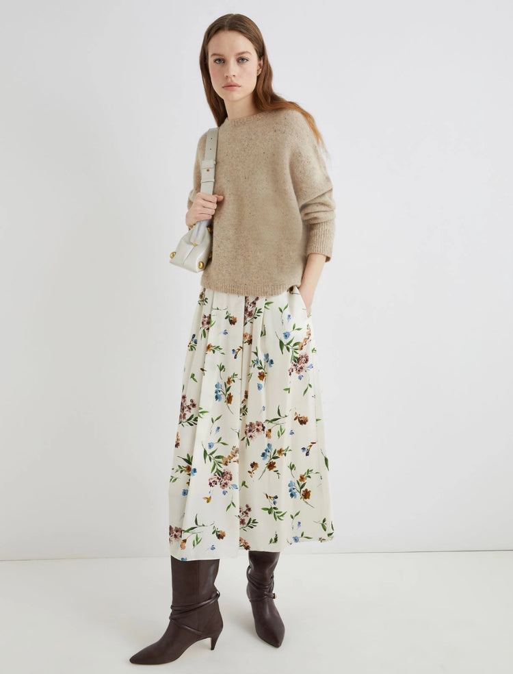 The knop yarn bestows a slight 3D texture, which pairs harmoniously with the flowing viscose skirt.