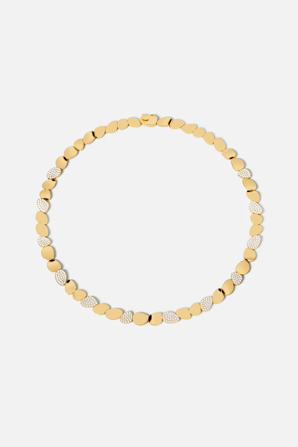 | Inspired by the coastline of the Mediterranean Sea, this choker embodies the essence of this beautiful landscape with a soft and organic feel. All our products are handcrafted in our ateliers Material: APM Alloy made of 95% recycled material and 18k yellow gold plated, anti-tarnishing and hypoallergenic Stone: White cubic zirconia Color: Yellow Gold Total chain length: 40 cm Closure: Pressing Clasp. Press the prominent part above the closure, and lightly pull the necklace to open. |