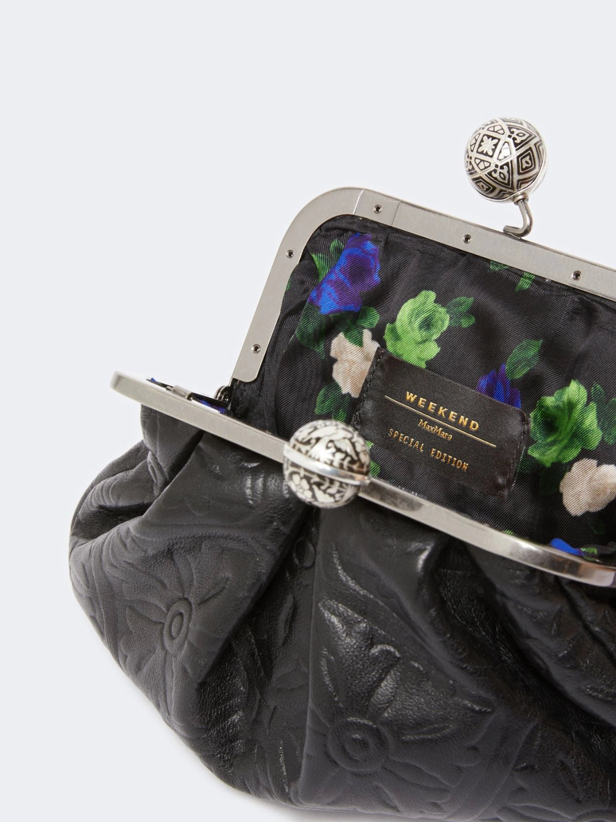 Crafted from smooth black lamb leather with a printed viscose lining, the Spanish Heritage Pasticcino bag offers elegant versatility—featuring a removable chain strap and engraved bobble clasp that make it a striking accessory for day or evening |