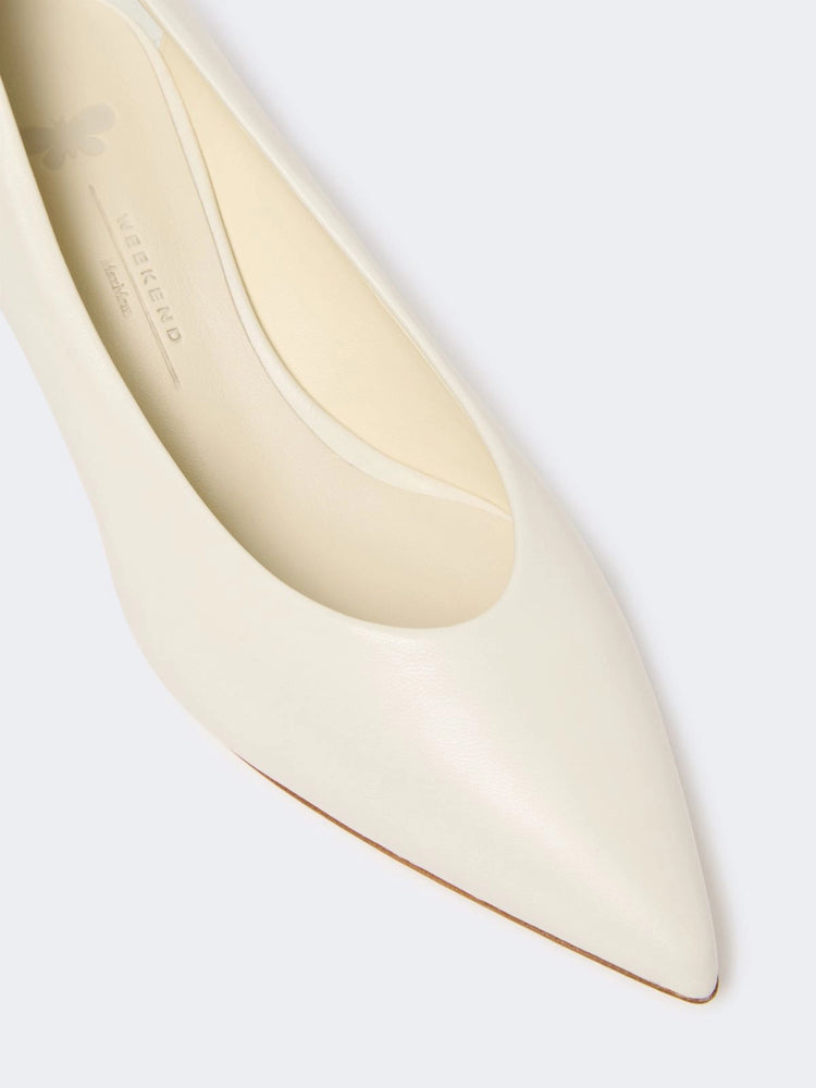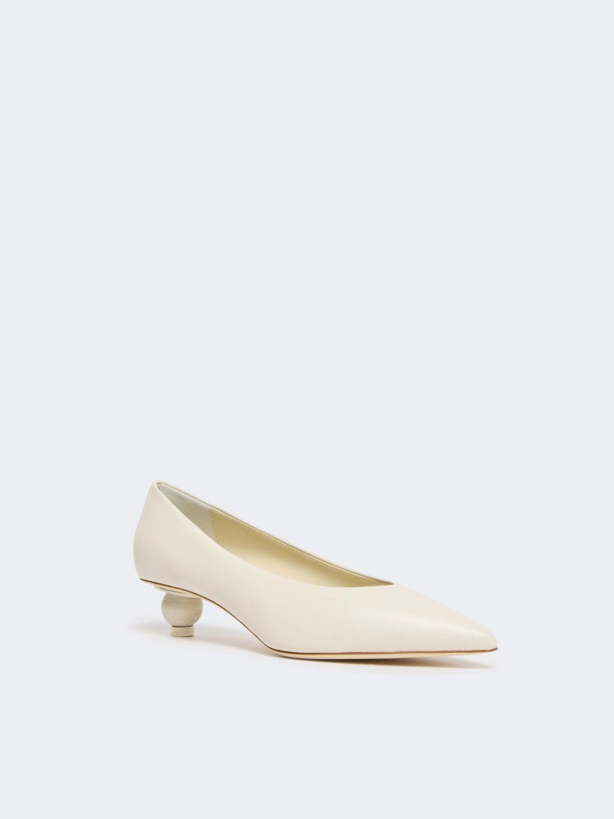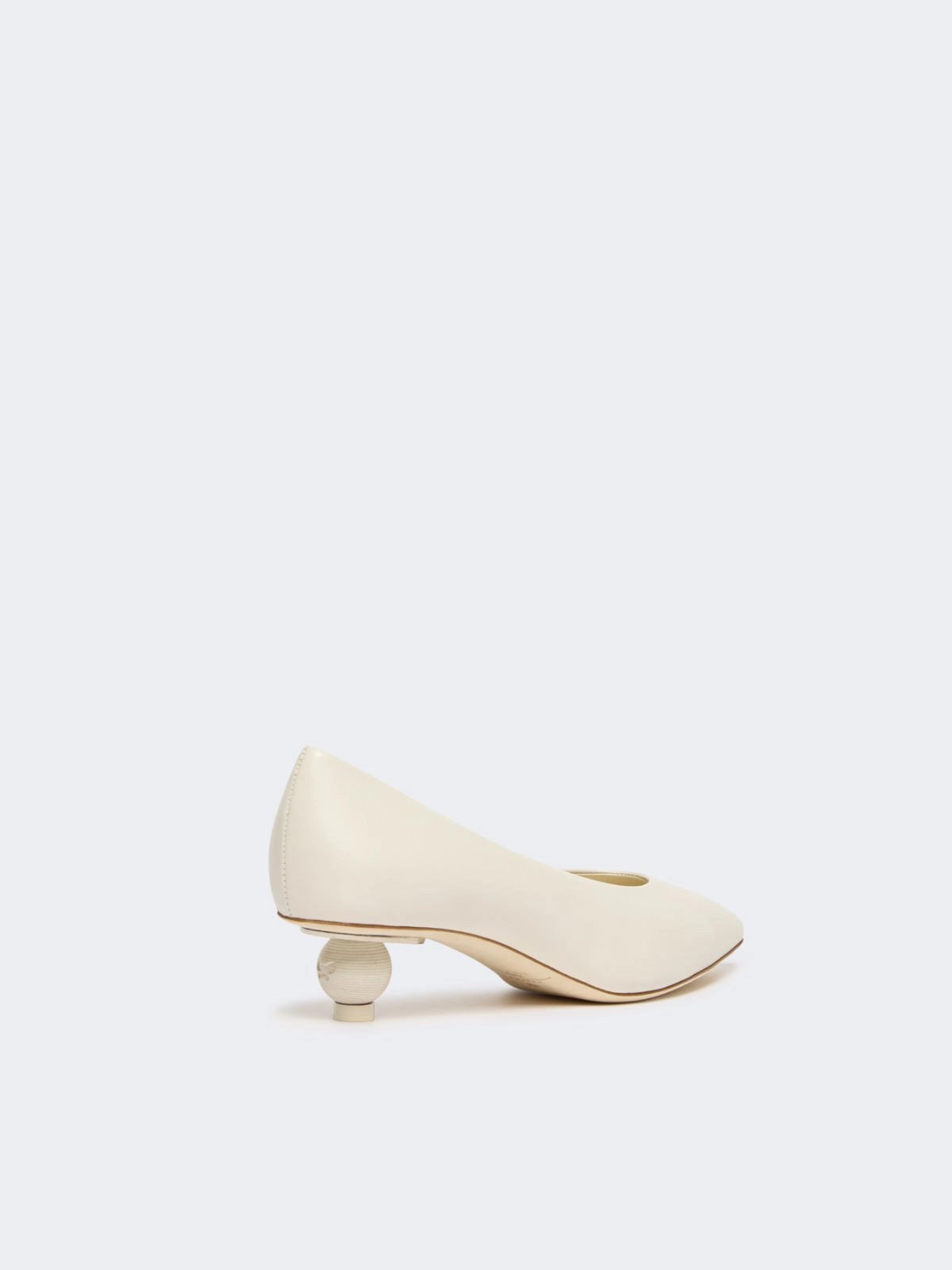 Pumps featuring an egg-shaped collar and slightly pointed toe. The design boasts a branded and tonal sphere heel, inspired by the iconic Pasticcino Bag.