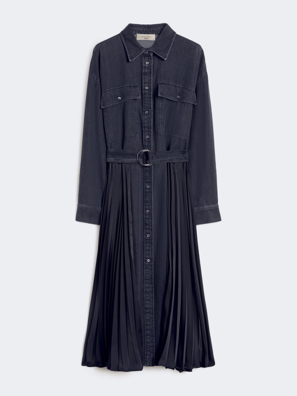 Midi shirt dress, featuring a pleated satin skirt and patch pockets on the chest.