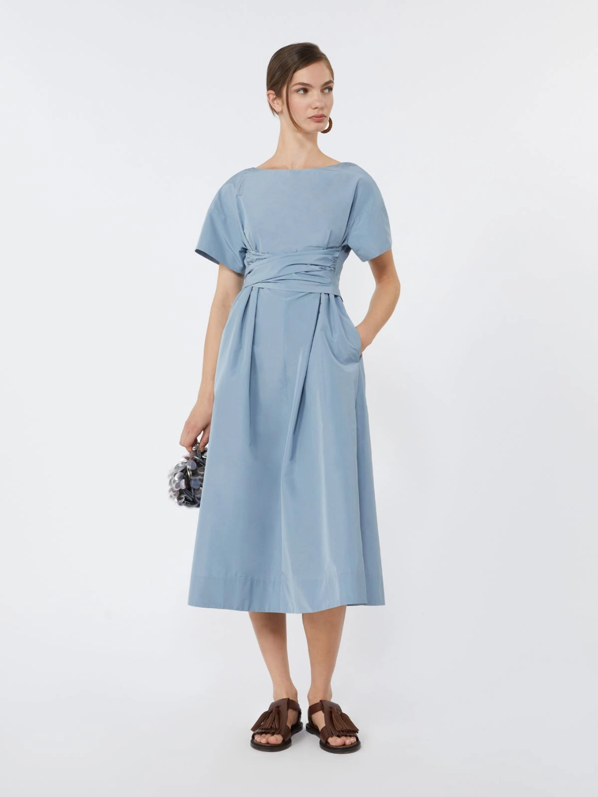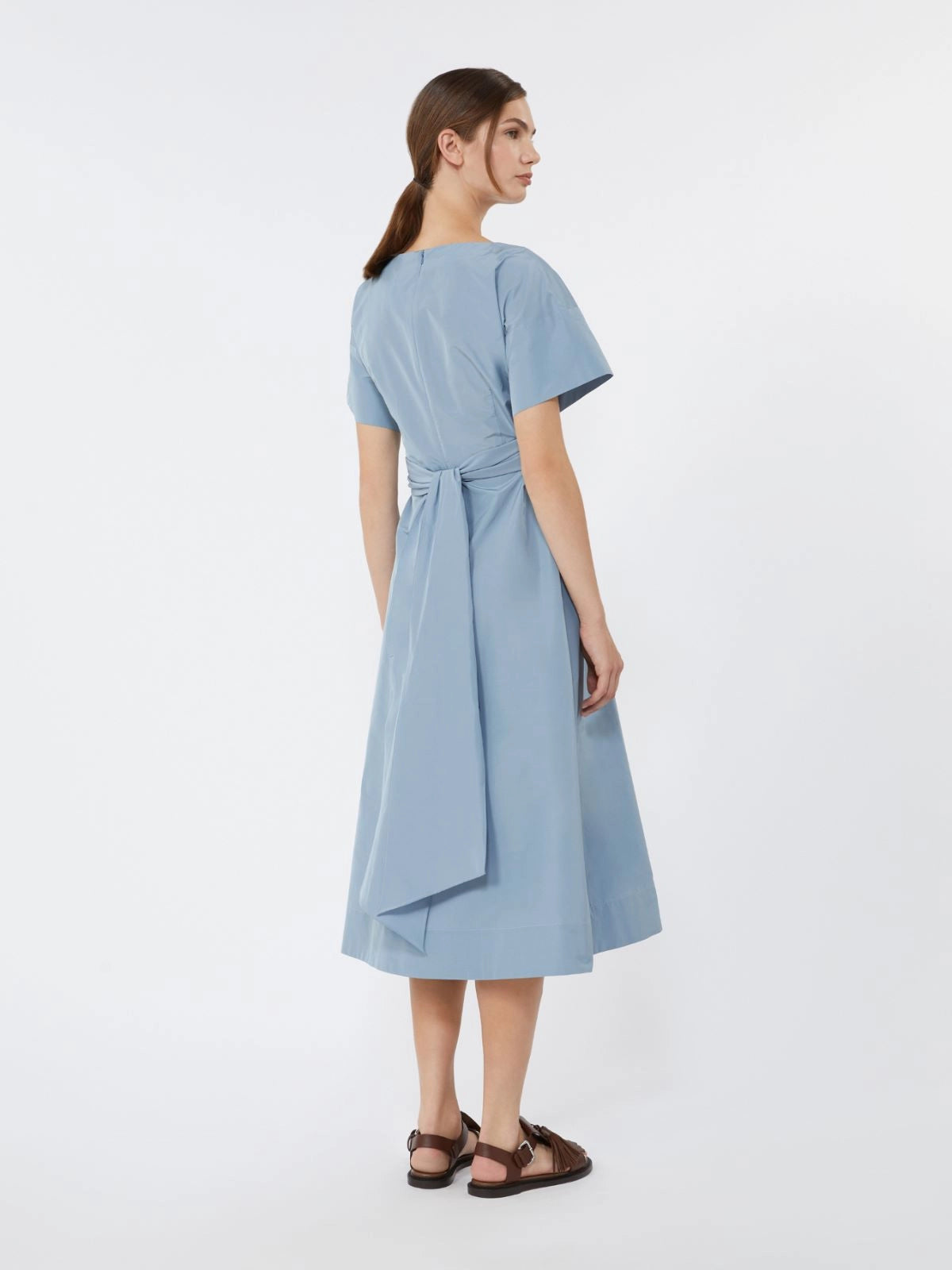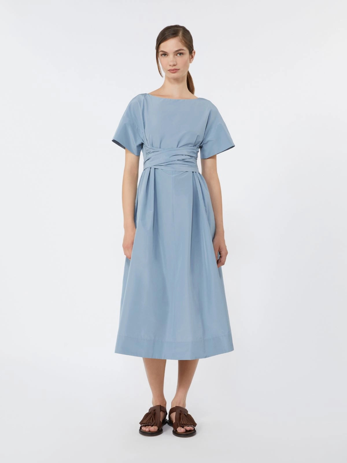 Midi dress with flared skirt and sashes that tie at the waist to accentuate the silhouette.