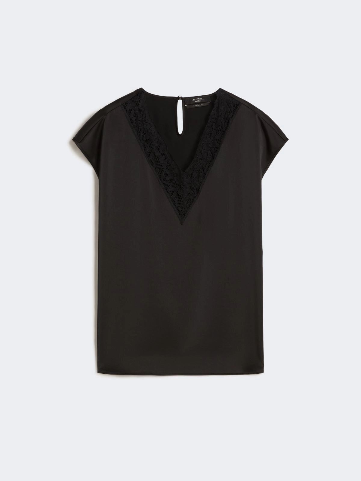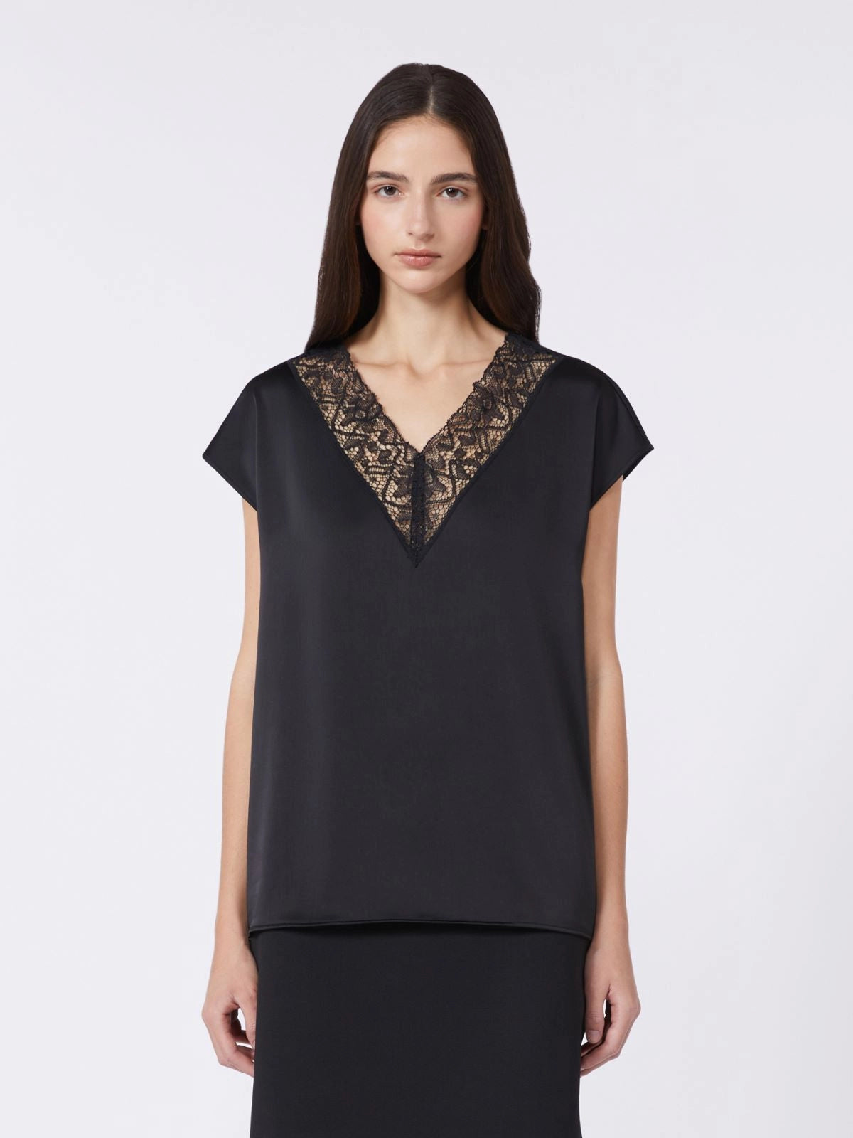 Sleeveless top featuring a passementerie lace trim along the neckline.