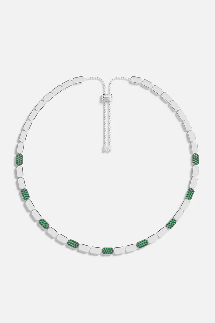 | The radiant green stones elegantly complements this necklace's design, creating a captivating contrast. All our products are handcrafted in our ateliers Material: Sterling silver Stone: Green cubic zirconia Color: Silver Total chain length: Adjustable to 65 cm max with sliding clasp |