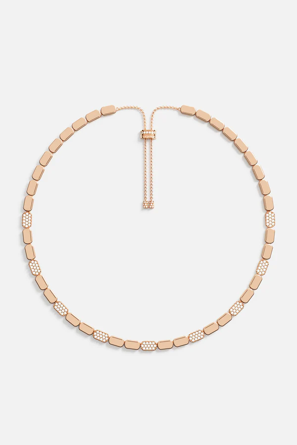 | This necklace made with APM Alloy and 18k rose gold plated is microset with white cubic zirconia. The APM Alloy is made of 95% recycled material. It is anti-tarnishing and Hypoallergenic. 2-year worldwide warranty Material: APM Alloy made of 95% recycled material and 18k rose gold plated, white cubic zirconia, anti-tarnishing and Hypoallergenic All our products are handcrafted and microset by hand in our ateliers Color: Rose gold Total chain length: Adjustable from 42 to 65 cm with sliding clasp |
