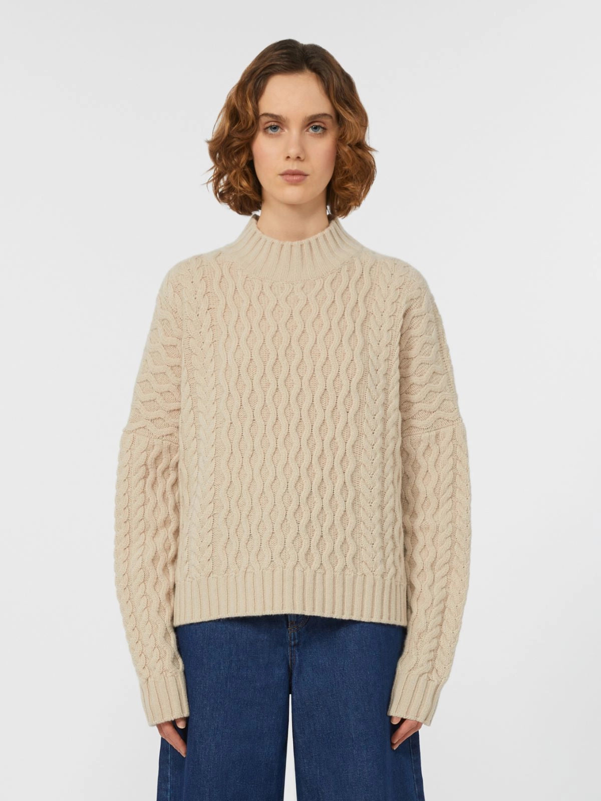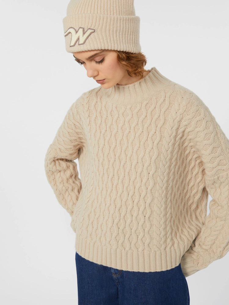 | ndulge in timeless sophistication with the YARD jumper—cut from 100% virgin wool, styled in a relaxed boxy silhouette with Aran-inspired cable-knit texture and a stand collar—an effortlessly elevated piece that brings both luxurious comfort and modern elegance to your knitwear wardrobe. |