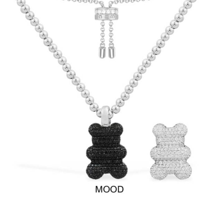 | Add some playful elegance to your jewellery box with this whimsical yet chic piece. Handcrafted in sterling silver, the necklace features a charming “Yummy Bear” pendant which is microset—one side sparkling with white cubic zirconia, the other face accented with black spinel, offering a striking contrast. The pendant is designed to be clippable, allowing you to detach it and attach it to other items—ideal for mix‑and‑matching your accessories. The chain is adjustable, ranging from 42 to 65 cm, secured by a sliding clasp so you can vary how low or close to the neck you want it to sit. The bear pendant has dimensions approximately 2.2 cm long by 1.6 cm wide, giving it presence without being overwhelming. |