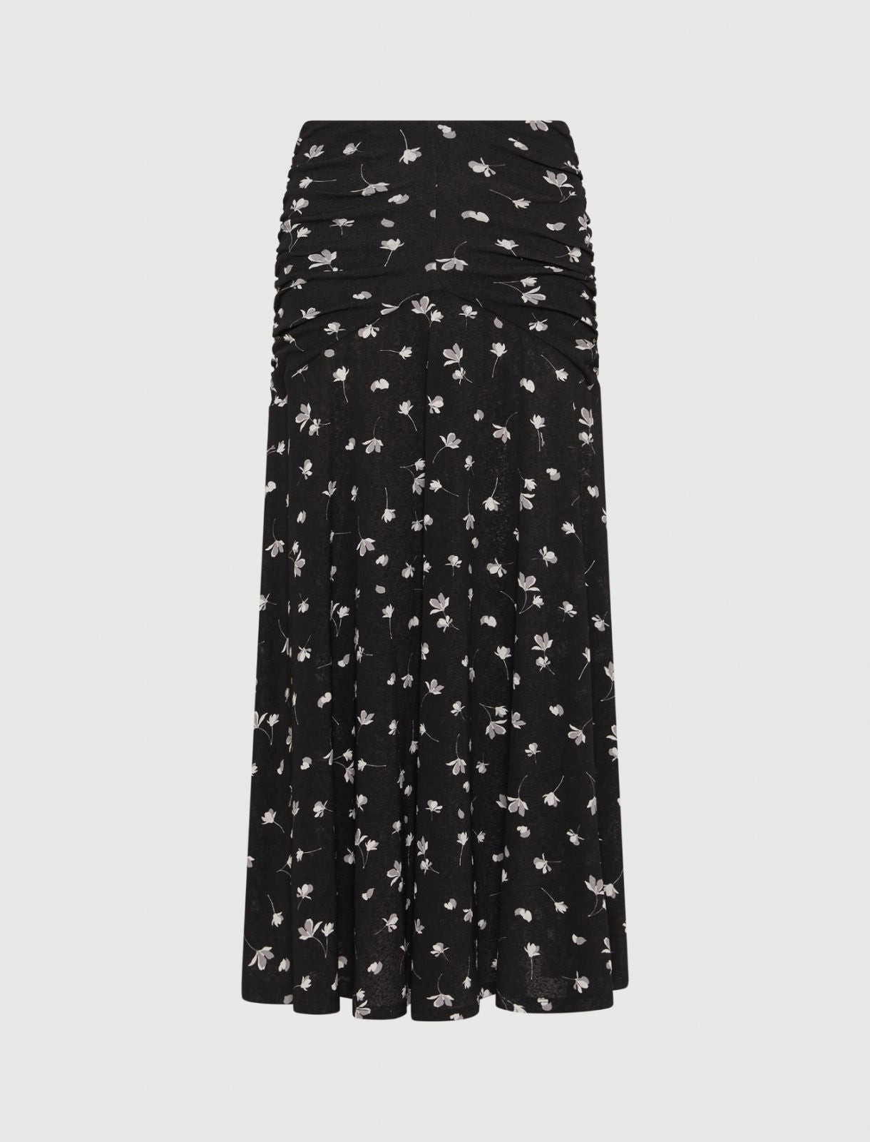 An up-to-date take on the timeless allure of the skirt: this new model boasts a yoke and asymmetrical darts which bestow dynamism to the design softened by micro floral prints.