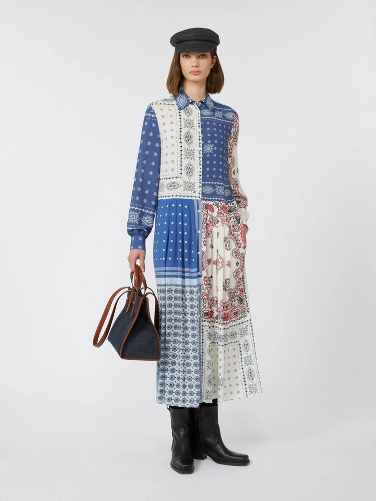 | Cut in fluid 100% viscose crepe de chine, the ZUAI shirt dress shines in soft light blue—its full pleated skirt, shirt collar and double cuffs blend elegance with graceful movement |